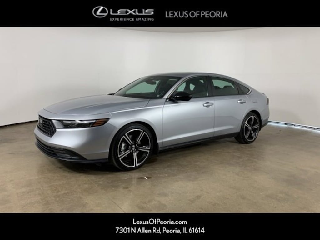 Solar Silver Metallic 2025 Honda Accord Hybrid Sport with Black interior - available now at Lexus of Peoria in Peoria, IL. This clean AutoCheck one-owner Accord Hybrid Sport delivers impressive fuel efficiency, modern technology, and athletic styling, making it an excellent midsize sedan for drivers who want performance and savings at the pump.