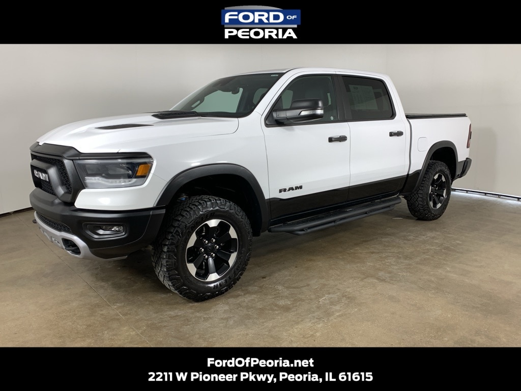 Bright White Clear-Coat 2021 Ram 1500 Rebel Crew Cab 4x4 with Black cloth and vinyl interior - available now at Ford of Peoria in Peoria, IL. This clean AutoCheck one-owner Ram 1500 Rebel blends aggressive off-road capability, powerful V8 performance, and bold Rebel-exclusive styling, making it an excellent choice for drivers who want a full-size truck that's equally ready for work, adventure, and everyday driving.