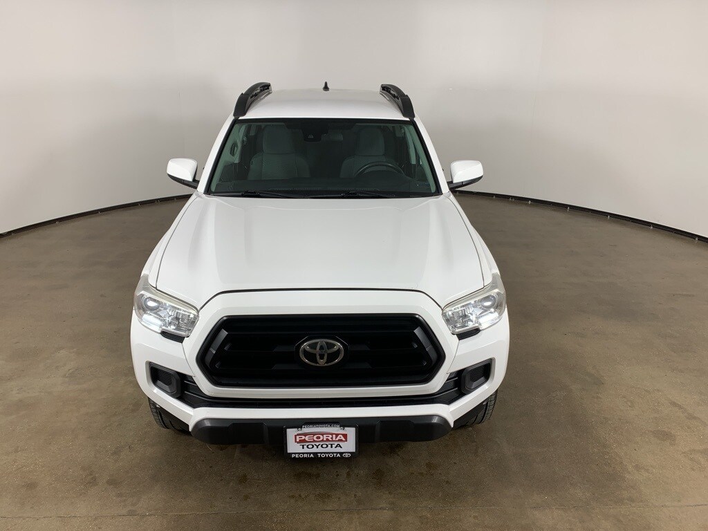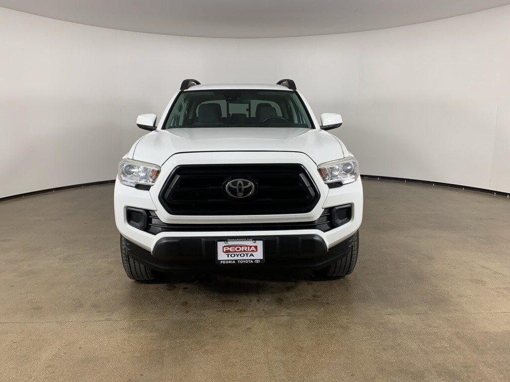 Super White 2020 Toyota Tacoma SR V6 with Gray fabric interior - available now at Peoria Toyota in Peoria, IL. This clean AutoCheck one-owner Tacoma SR blends Toyotas proven truck durability with versatile everyday capability. Equipped with a 3.5-liter V6 engine, 6-speed automatic transmission, 16-inch steel wheels, fabric bucket seats, and essential convenience and safety features, this Tacoma delivers reliable performance for both work and daily driving.