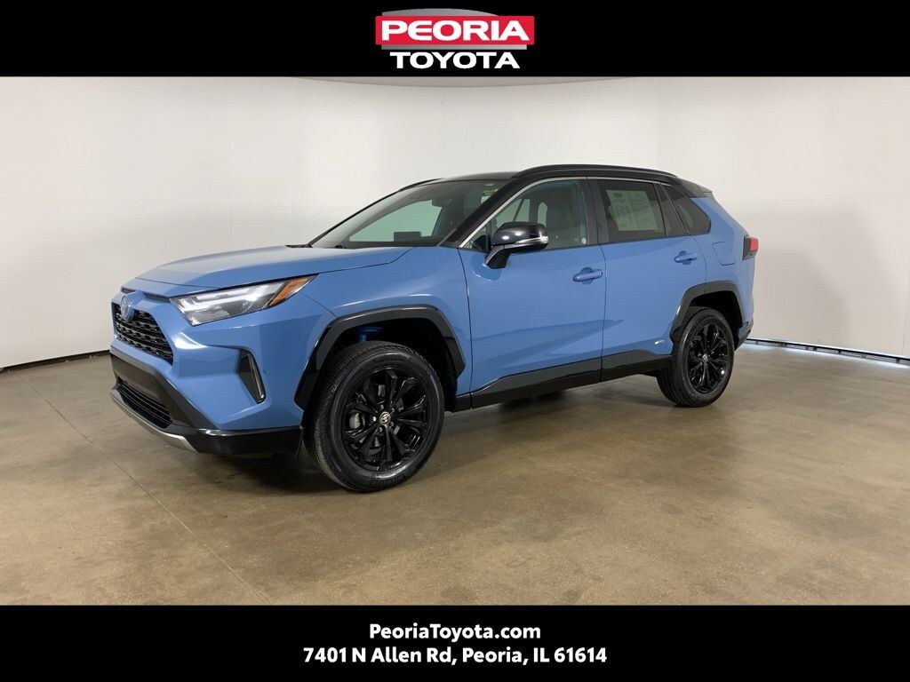Cavalry Blue 2022 Toyota RAV4 Hybrid XSE AWD with Midnight Black SofTex interior - available now at Peoria Toyota in Peoria, IL. This clean AutoCheck 2022 Toyota RAV4 Hybrid XSE AWD delivers sporty styling, hybrid efficiency, and Electronic On-Demand All-Wheel Drive capability in one of the most popular SUVs in Central Illinois. Built in Georgetown, Kentucky , this RAV4 Hybrid blends performance and fuel savings with premium XSE features.