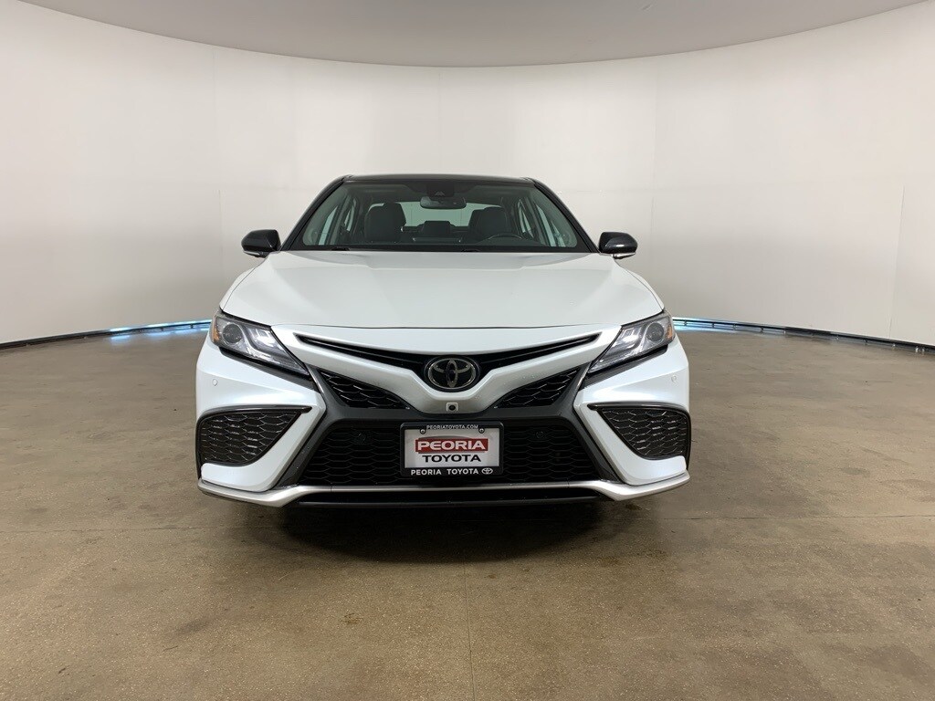 Wind Chill Pearl 2024 Toyota Camry XSE with Midnight Black Metallic roof and Black leather-trimmed interior - available now at Peoria Toyota in Peoria, IL. This Camry XSE stands out with striking two-tone styling, sporty design details, and a well-equipped interior that blends performance, technology, and everyday comfort. Finished in Wind Chill Pearl with a contrasting Midnight Black Metallic roof, this Camry XSE is equipped with the Cold Weather Package, Driver Assistance Package, Navigation Package, and a Panoramic Glass Roof, delivering a premium driving experience with confident road presence and Toyotas renowned reliability.